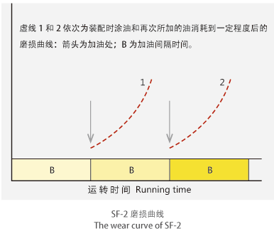 在油脂潤滑條件下的磨損特性,如下圖:它的“跑合” 磨損率很?。挥蓤D中的線段可見,當(dāng)裝配時所涂的油脂消耗到一定程度時,其磨損率逐漸增大,如虛線1所示;如果在磨損率上升之前再次加油,則其磨損率仍保持平穩(wěn);當(dāng)加油間隔的時間合適時,材料的使用壽命可大為延長。該加油間隔的時間取決于累計(jì)磨損量。 脂潤滑時:環(huán)境溫度低于80℃,推薦使用鋰皂基油脂;環(huán)境溫度高于80℃,推薦使用硅油基潤滑脂;不推薦含有EP添加劑的油脂。